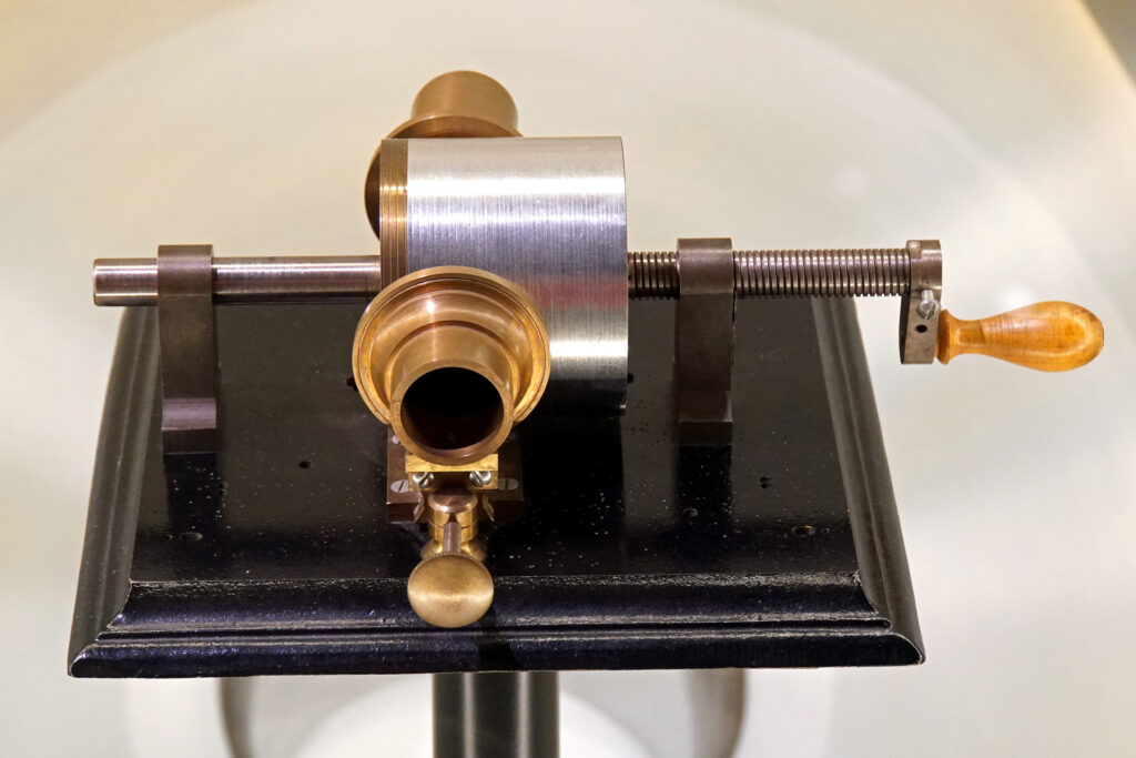 [źródła ilustracji: By Édouard-Léon Scott de Martinville (1817–1879) – Franz Josef Pisko, Die neueren Apparate der Akustik (Vienna, 1865). Downloaded from firstsounds.org, Public Domain, https://commons.wikimedia.org/w/index.php?curid=8853164; Édouard-Léon Scott de Martinville (1817–1879) – Certificate of addition to Scott de Martinville’s patent #31470 (dated 29 July 1859 and preserved by INPI, the French patent office). Downloaded from firstsounds.org, Public Domain, https://commons.wikimedia.org/w/index.php?curid=8853442; Norman Bruderhofer, www.cylinder.de – own work (transferred from de:File:Phonograph.jpg), CC BY-SA 3.0, https://commons.wikimedia.org/w/index.php?curid=427395; Dennis G. Jarvis – DSC01266 – A Delicate Balance, CC BY-SA 2.0, https://commons.wikimedia.org/w/index.php?curid=111023723]