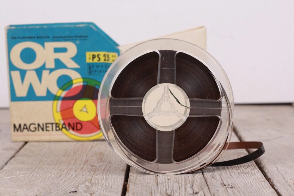 [źródła ilustracji: Gregory F. Maxwell <[email protected]> PGP:0xB0413BFA – own work by the first uploader, GFDL 1.2, https://commons.wikimedia.org/w/index.php?curid=193240; Julius Weinberger – Retrieved 2016-08-04 from Weinberger, Julius (June 1922) „The recording of high speed signals in radio telegraphy” in Proc. of the Institute of Radio Engineers, The Institute of Radio Engineers, New York, NY, Vol. 10, No. 3, p. 181, fig. 2 on Google BooksRetouched by combining with a version found in https://worldradiohistory.com/Archive-IRE/20s/IRE-1922-06.pdf retrieved from https://worldradiohistory.com/IRE_Proceedings.htm, Public Domain, https://commons.wikimedia.org/w/index.php?curid=50481082; Webster-Chicago Corporation (costruttore) – Catalogo collezioni (Italian). Museoscienza.org. Museo nazionale della scienza e della tecnologia Leonardo da Vinci, Milano., CC BY-SA 4.0, https://commons.wikimedia.org/w/index.php?curid=48926258; https://byjus.com/physics/ferromagnetism/; https://www.etsy.com/pl/listing/789623911/orwo-vintage-german-reel-tape-recorder; https://allegrolokalnie.pl/oferty/q/kasety%20audio%20%2F%20stilon; https://redro.pl/obraz-vhs-video-tape-cassette-isolated-on-white,199600320; https://oldcomputer.info/media/qic/index.htm]