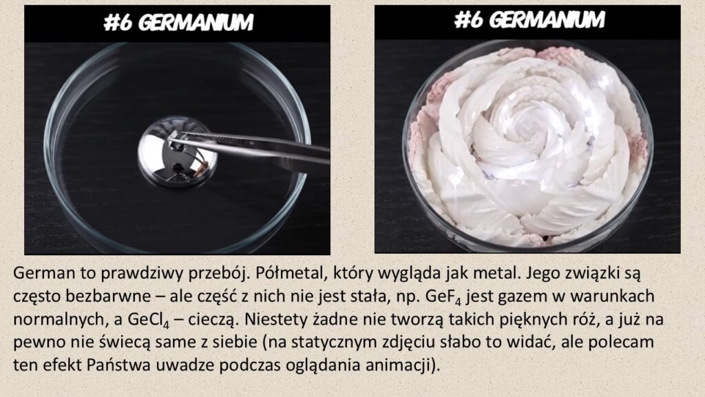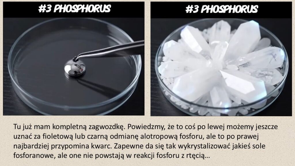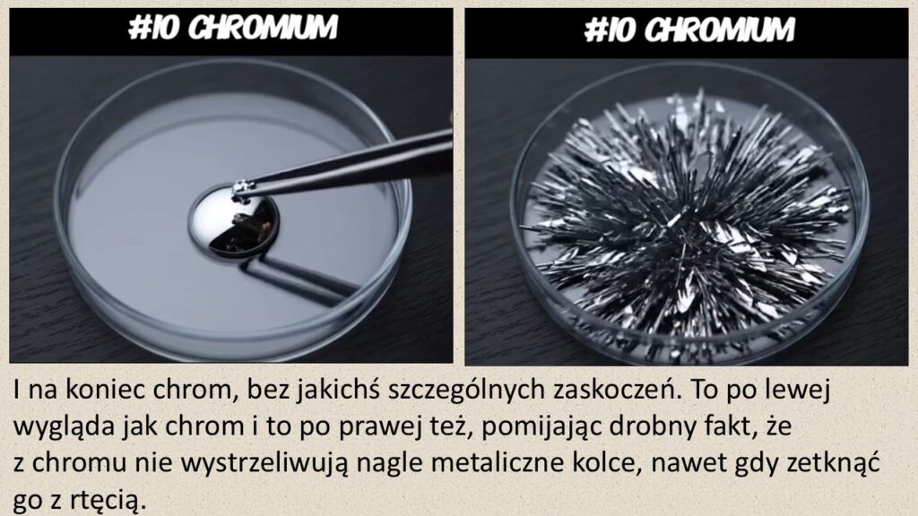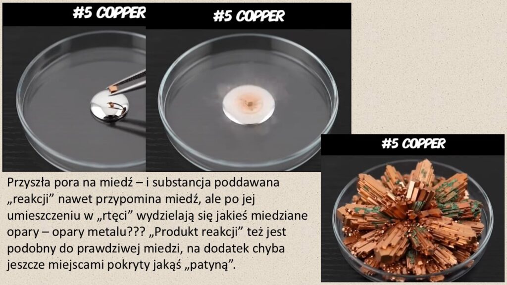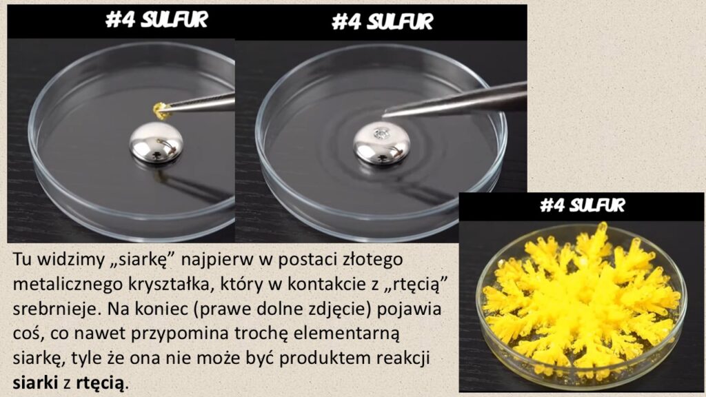 Animacja ta – pod względem wizualnym zresztą nie do odróżnienia od filmu – pokazuje właśnie „reakcje” różnych pierwiastków z czymś, co wedle wszelkich oznak jest rtęcią. Na szalce Petriego widzimy dużą kroplę nieprzezroczystej, srebrzystej cieczy, której duża siła kohezji sugeruje, że jest to właśnie ten metal. Owszem, rtęć reaguje z metalami, tworząc amalgamaty, ale bodaj tylko jedna taka reakcja, z glinem, jest rzeczywiście bardzo spektakularna: