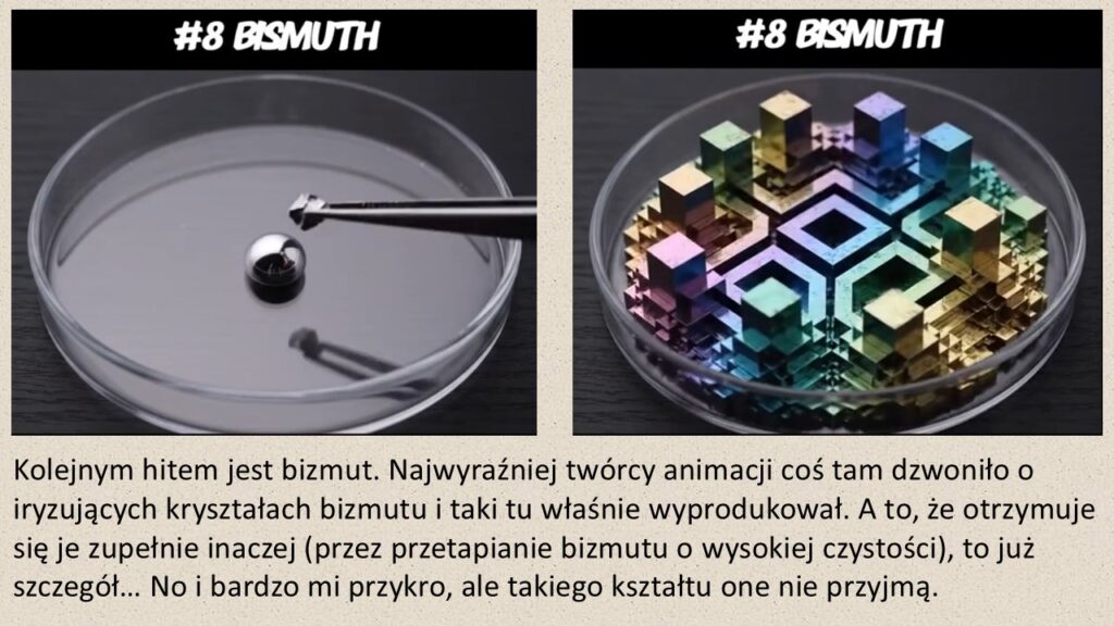 W ostatnich latach erozja prawdy i informacji, już od dawna napędzana postępami komputerowej obróbki dźwięku i obrazu, nabrała tempa „dzięki” programom zwanym „sztuczną inteligencją” (SI). Widziałem już dość sporo podrasowanych – czyli poniekąd sfałszowanych – zdjęć minerałów i substancji chemicznych, a także co nieco filmów pokazujących „reakcje chemiczne”, i wzbudziło to mój umiarkowany dyzgust. Jednak gdy kilka dni temu pewien znajomy podrzucił mi link do animacji z rumuńskiej strony Fun Factoristul na Facebooku, to już się – jak mówią nieco młodsi użytkownicy social mediów – striggerowałem.
