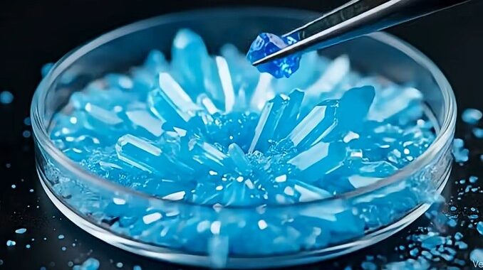 W całości animację można obejrzeć pod tym adresem https://www.facebook.com/reel/1398576657908885, a oryginalnie pochodzi ona z dostępnego na YouTube kanału ShearWhispers https://www.youtube.com/@ShearWhispers/shorts. Owszem, są to rzeczy bardzo przyjemne dla oka, szkoda tylko, że ich twórcy nie pokusili się o zapoznanie z chemiczną wiedzą. A przynajmniej powinni opatrzeć te filmiki adnotacją, że to czysta fantazja niemająca nic wspólnego z rzeczywistością. Przykładowo na obrazku wiodącym (na samej górze wpisu) mamy „coś” z innej animacji z tego kanału, podpisane jako grandidieryt. W rzeczywistości to jest najbardziej podobne do siarczanu(VI) miedzi(II), a ten minerał wygląda naprawdę tak: