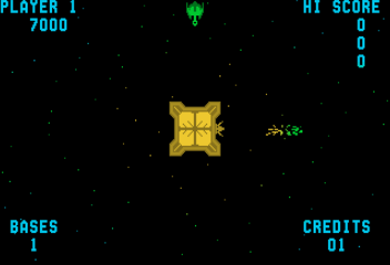 Zaczniemy właśnie od automatu, który pamiętam z kawiarenki – „Space Zap”, gra z 1980 roku, którą pomógł mi zidentyfikować niezawodny Kamil Gałczyński (bo ja oczywiście nie pamiętałem tytułu). Grałem w to – czasem z pomocą mojego taty („Ja kieruję, a ty strzelasz”) – w Ustroniu gdzieś na początku lat 80. Była to w sumie prosta gra, jak praktycznie wszystkie tytuły z tamtego okresu: jednoekranowa strzelanka z aż trzema rodzajami przeciwników. Gracz zawiadywał w niej kosmiczną bazą uzbrojoną w działo laserowe, które można było skierować na lewo, prawo, w górę lub w dół przez naciśnięcie odpowiedniego z czterech przycisków. Piąty przycisk służył do strzelania. Z tych czterech stron wokół bazy pojawiały się statki wroga, które zrzucały na naszą bazę miny – te miny trzeba było zestrzelić, można też było zestrzelić wrogie jednostki (dawało to odpowiednio 250 i 500 punktów). Od czasu do czas pojawiał się satelita dokonujący samobójczego ataku na naszą bazę – dość trudno go było zniszczyć, ponieważ dość szybko okrążał naszą bazę zanim w nią uderzył. Likwidacja tego satelity była warta aż 2 tysiące punktów. Gracz miał początkowo trzy życia, ale można było uzyskać dodatkowe po zdobyciu określonej liczby punktów, np. 75 tysięcy. Gra nie miała nawet szczątkowej fabuły (co można porównać z opisanym już przeze mnie „Arkanoidem”) i brzmi to wszystko dość banalnie – trzeba jednak pamiętać, że elektroniczna rozrywka wtedy w Polsce dopiero raczkowała i nawet takie gry wciągały miłośników komputerów i skłaniały do wydawania mnóstwa pieniędzy. Zwłaszcza że „operatorzy” takich urządzeń mogli podbijać poziom trudności rozgrywki, żeby tylko naiwne dzieciaki nie bawiły się zbyt długo za dychę.
